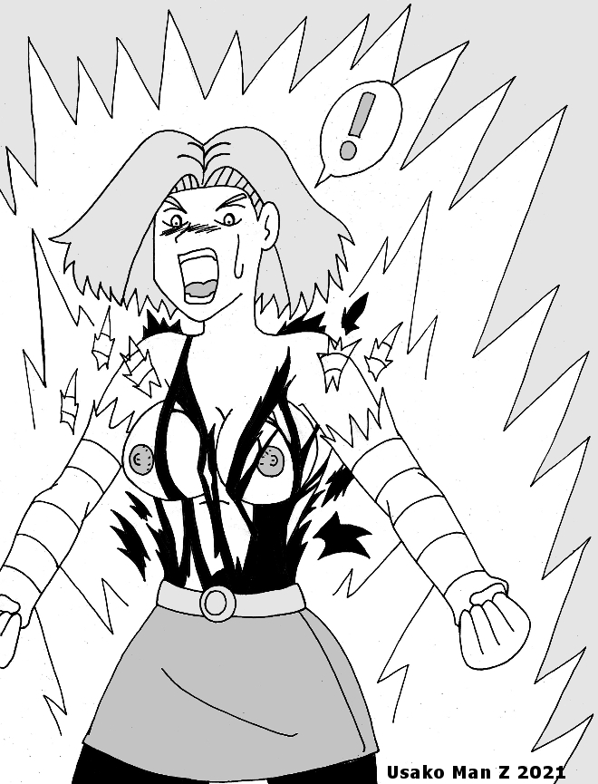 Android 18 powers up so much, her top couldn't withstand it.