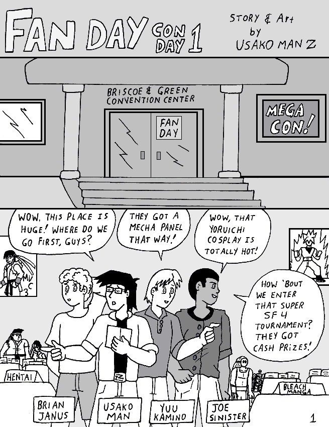 Our very first look at Usako Man, Joe Sinister, Yuu Kamino and Brian Janus. While in my older series I could only imagine what an anime con is like, by now I've been to several so I knew more or what to draw. Man, Marvel VS Capcom 3 was still new at the time.